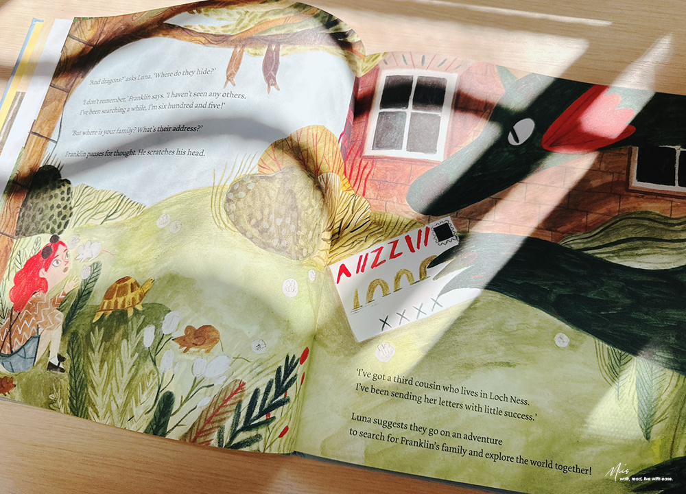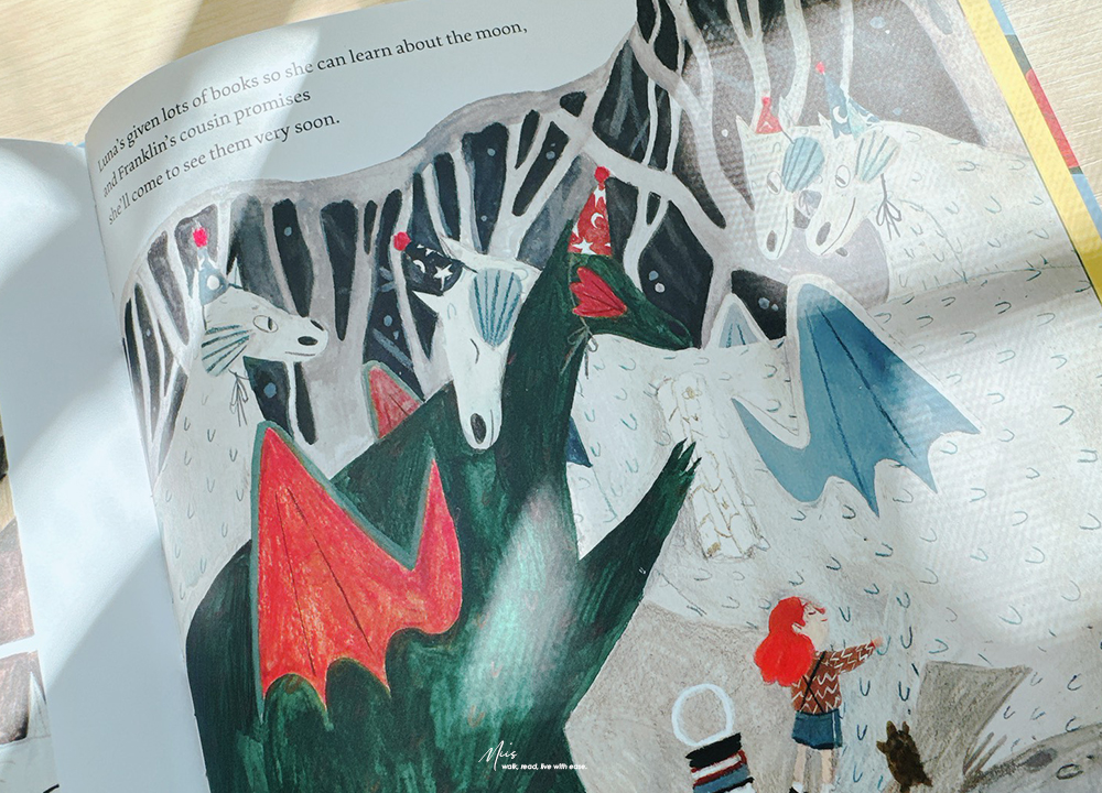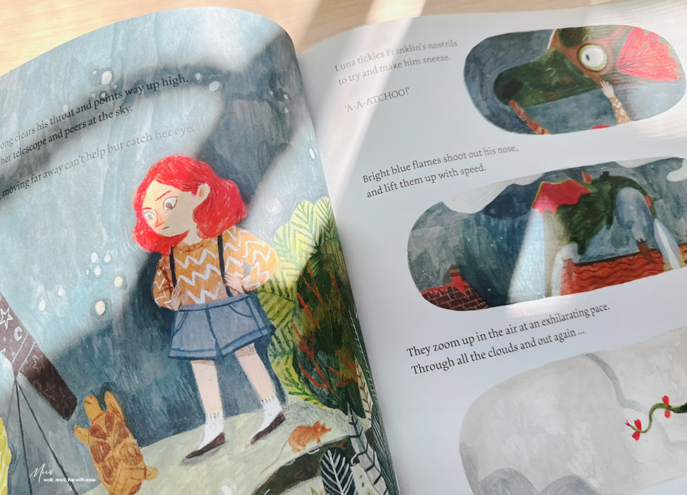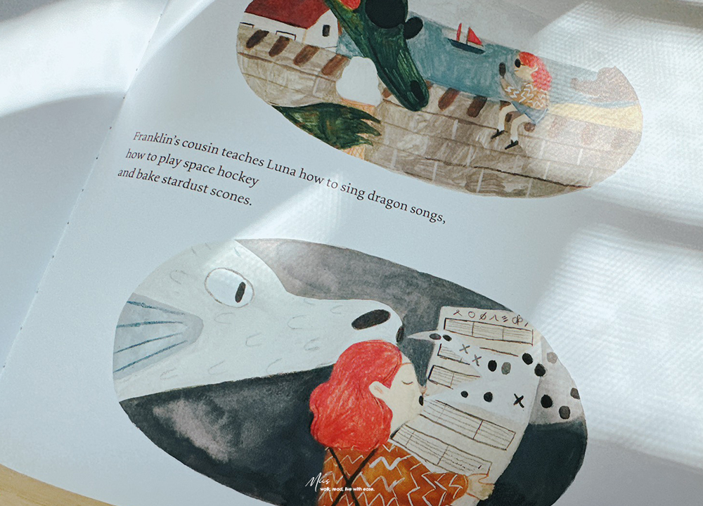 小女孩 Luna 和她的好朋友,一隻叫做Franklin的龍 。兩人熱愛閱讀、熱愛書中的各種奇妙生物與冒險,Luna 對 Franklin 的出身感到好奇?為什麼沒有其他龍與他相伴?於是開始動身尋找,沿途他們遇到了許多神奇的生物,吃義大利麵的雪人、讀莎士比亞的吸血鬼、跳 disco 的獨角獸……但沒有一個能幫助他們找到Franklin的家。。他們Google 龍的族譜、寄email給公主,都沒有消息。有天當Luna仰望天空時有了想法,牠決定去太空中尋找。在太空中漫無目的的飛行,正要放棄時Franklin似乎想起了什麼?以下分享部分書頁