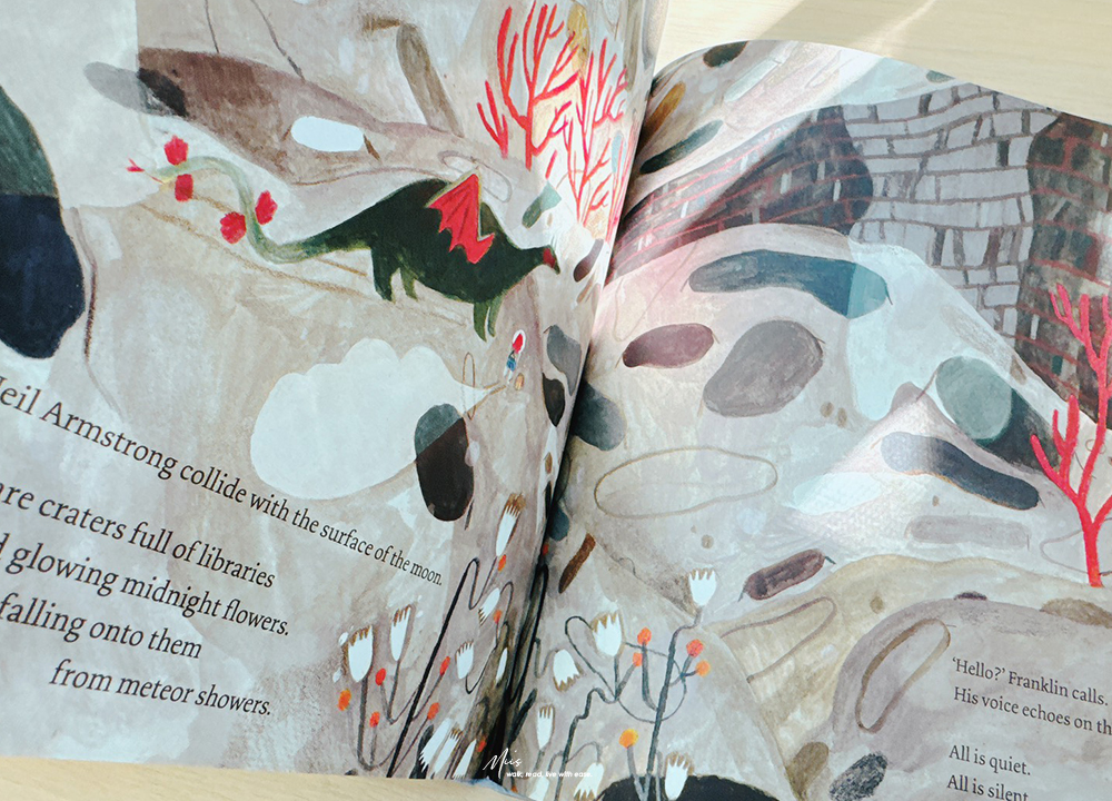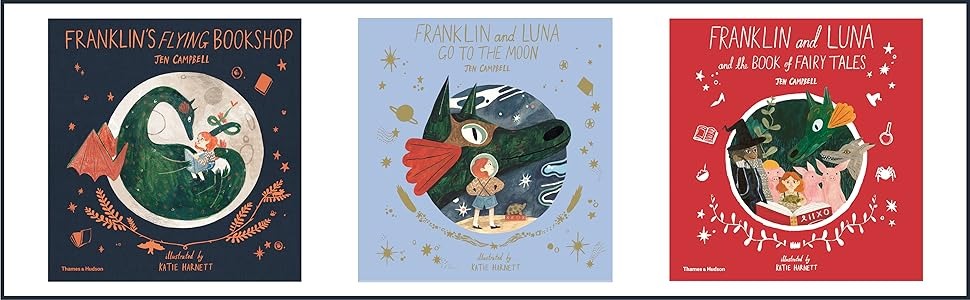 英國作家 Jen Campbell 筆下的龍 Franklin 和女孩 Luna,這個系列從 Franklin’s Flying Bookshop 開始,一隻住在城市裡的龍,與勇敢的女孩 Luna 成為朋友,共同經營一間會飛的書店。接著在 Franklin and Luna Go to the Moon 中,兩人為了尋找遺失的龍族同伴,一路飛向月球,也就是今天要介紹的繪本。系列最終篇 Franklin and Luna and the Book of Fairy Tales 則讓他們進入一本童話書裡,穿梭各種經典故事之間。(後續將陸續介紹 ) 這三本書都由插畫家 Katie Harnett 繪製,每一頁都像一場夢,讓讀者在書頁之間體會友情、勇氣與閱讀的魔法。