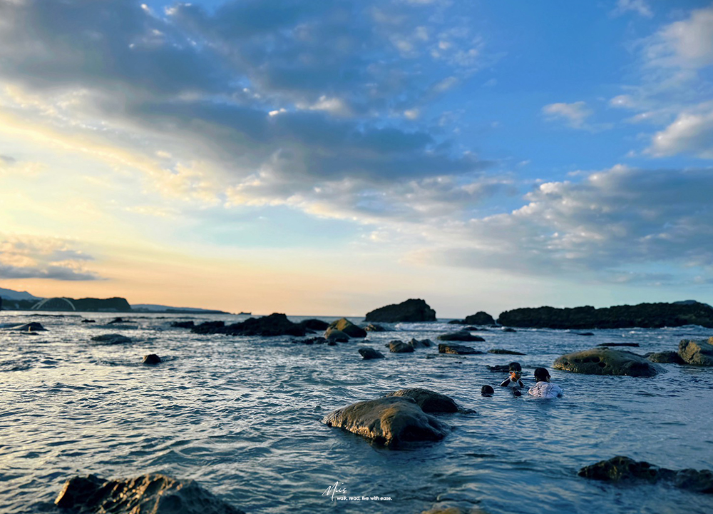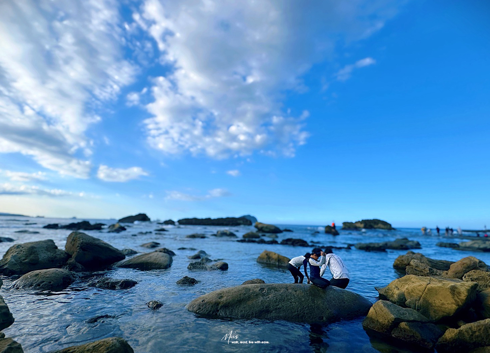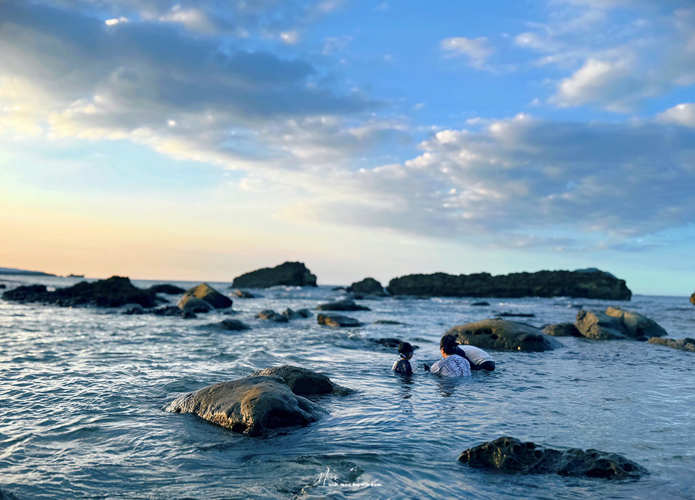這裡的螃蟹可以讓小傢伙忙很久,到處可以看到家庭遊客和小不點們在和螃蟹追逐,通常都會躲在石縫中,隨手翻翻找找都能發現他們的足跡。另外熱帶魚也不少,戴上蛙鏡潛進水裡,才能清楚看到牠們在水中靈活穿梭。另外要特別留意藤壺與貝類,退潮後會出現在岩石上,不要割傷了,也別忘了請輕柔的觀察小動物們不要抓回家。