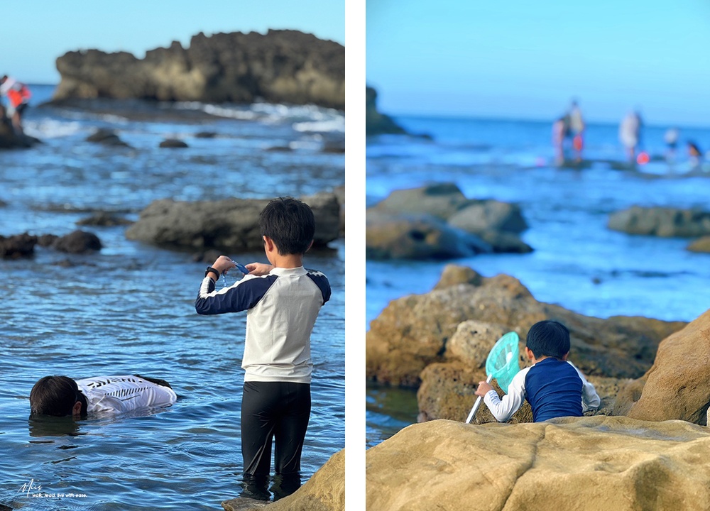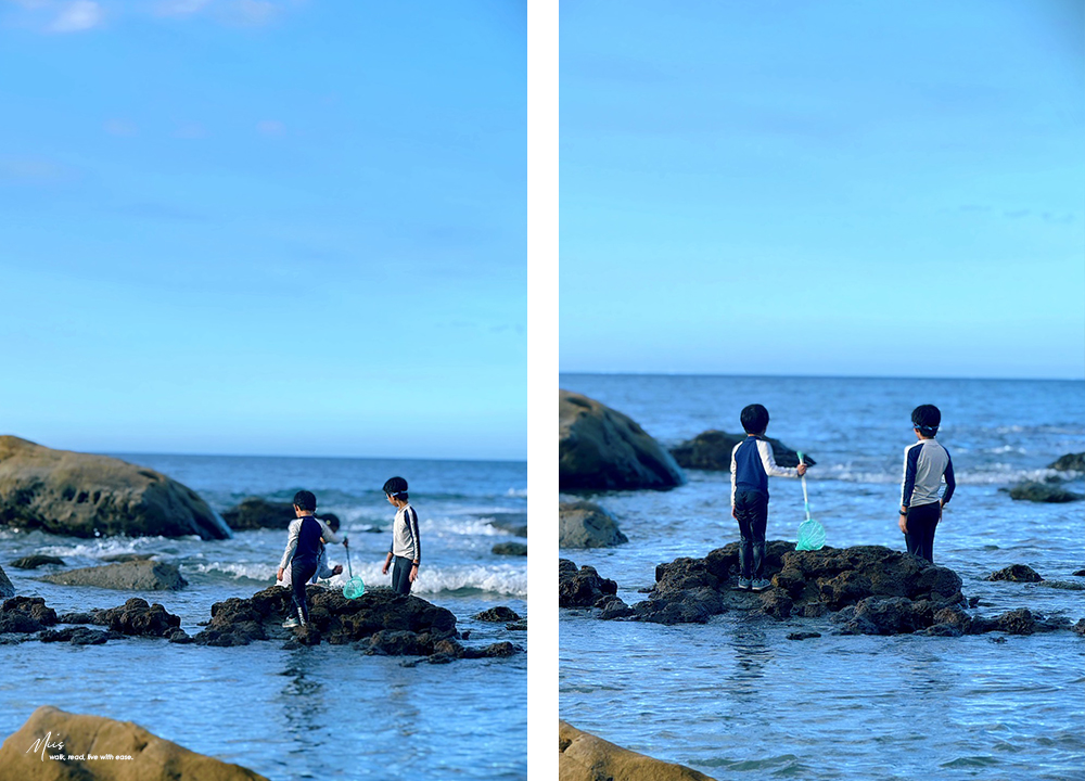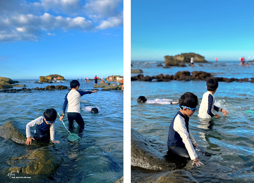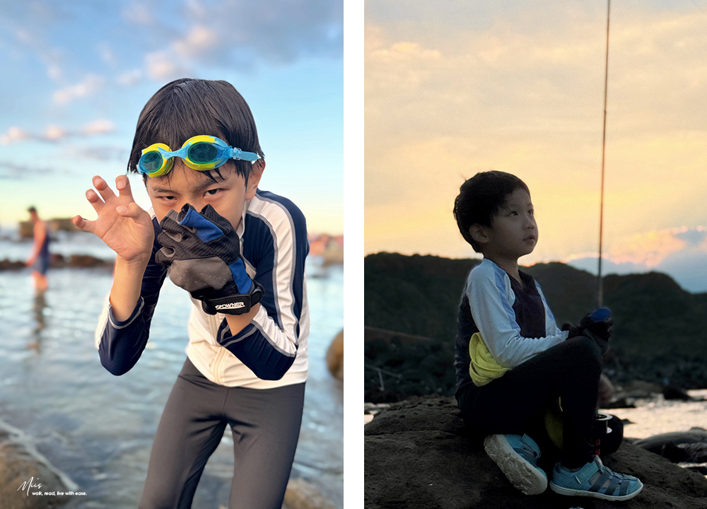 我們算準退潮時間抵達,時間抓得剛剛好。弟弟可米一開始試圖釣魚,但最後還是選擇玩水找螃蟹比較重要。哥哥則全身心投入海水裡,從追魚到觀察螃蟹,完全就是今天就是要待在水中的態度。回程在車上,兩兄弟秒斷電,這就值得啦!