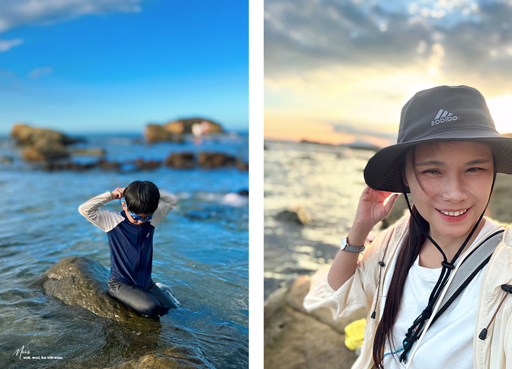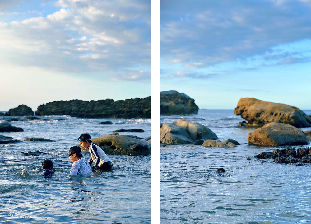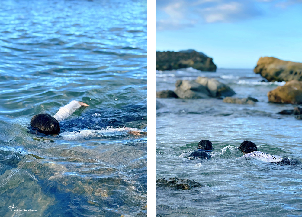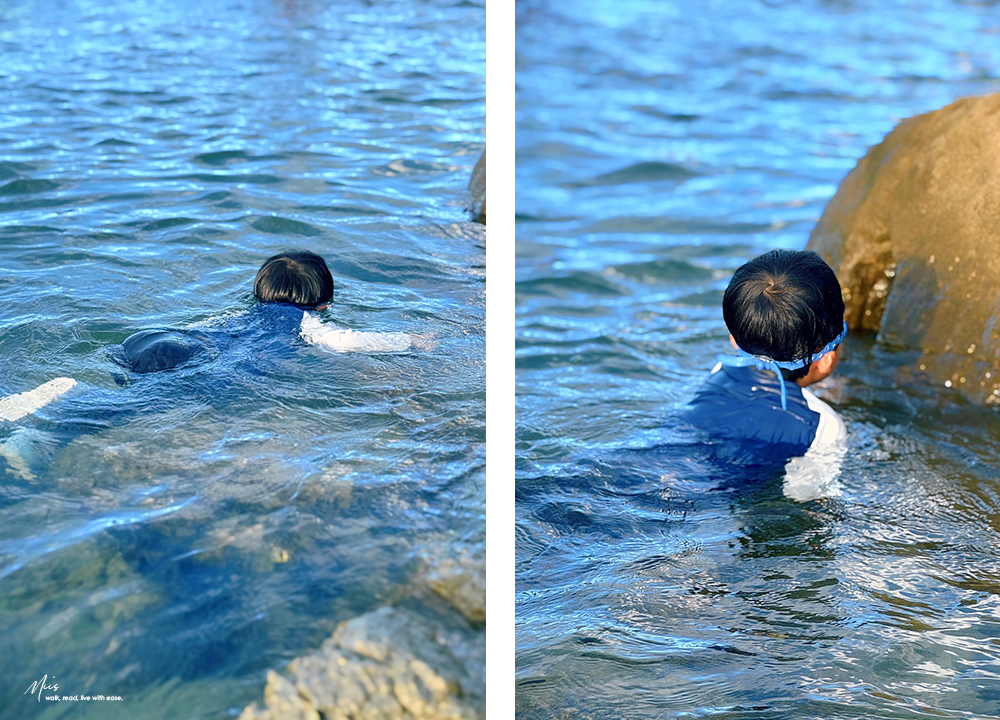 媽媽大部分時間都在看海發呆或是幫兩兄弟拍照,悠閒的很,這2隻米米忙得不可開交。因為泡海水太舒服,最後全都戴上蛙鏡直接潛進去觀察熱帶魚