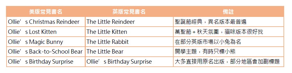 英國版 和 美國版 會因為出版社不同而改書名。例如 Ollie’s Christmas Reindeer 在某些版本裡就叫做 The Little Reindeer。以下列出詳細書目以便大家參考