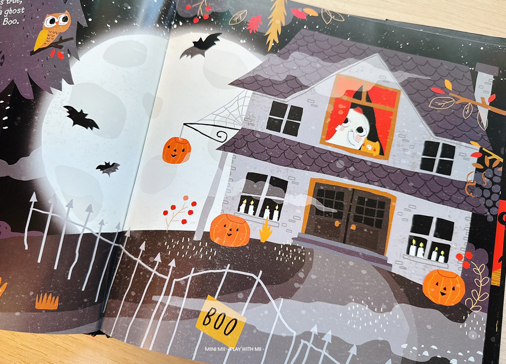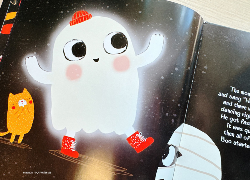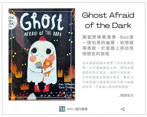 Boo是一個小幽靈,但他居然怕黑!為了變得勇敢,他決定鼓起勇氣,踏上拜訪各種怪物朋友的旅程。故事裡會出現女巫、吸血鬼、骷髏等角色,全都用可愛的方式呈現。故事主要在說,勇敢不是不怕,而是雖然害怕還是願意去嘗試。你害怕什麼,能不能像Boo一樣試著跨出一步。這本書還有一個很可愛的特色,書本在夜裡會發光喔!