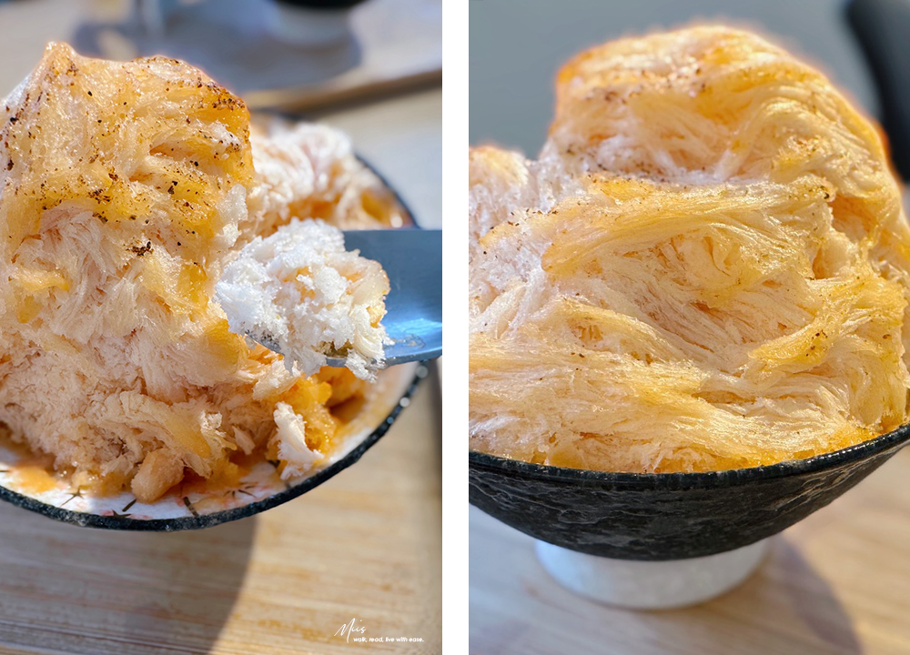 粉嫩橘的色澤,聞起來有淡淡芭樂香氣。上頭灑了些梅粉,酸鹹味讓整體更有層次;不過我個人更喜歡不加梅粉,能更直接感受到水果本身的清甜。