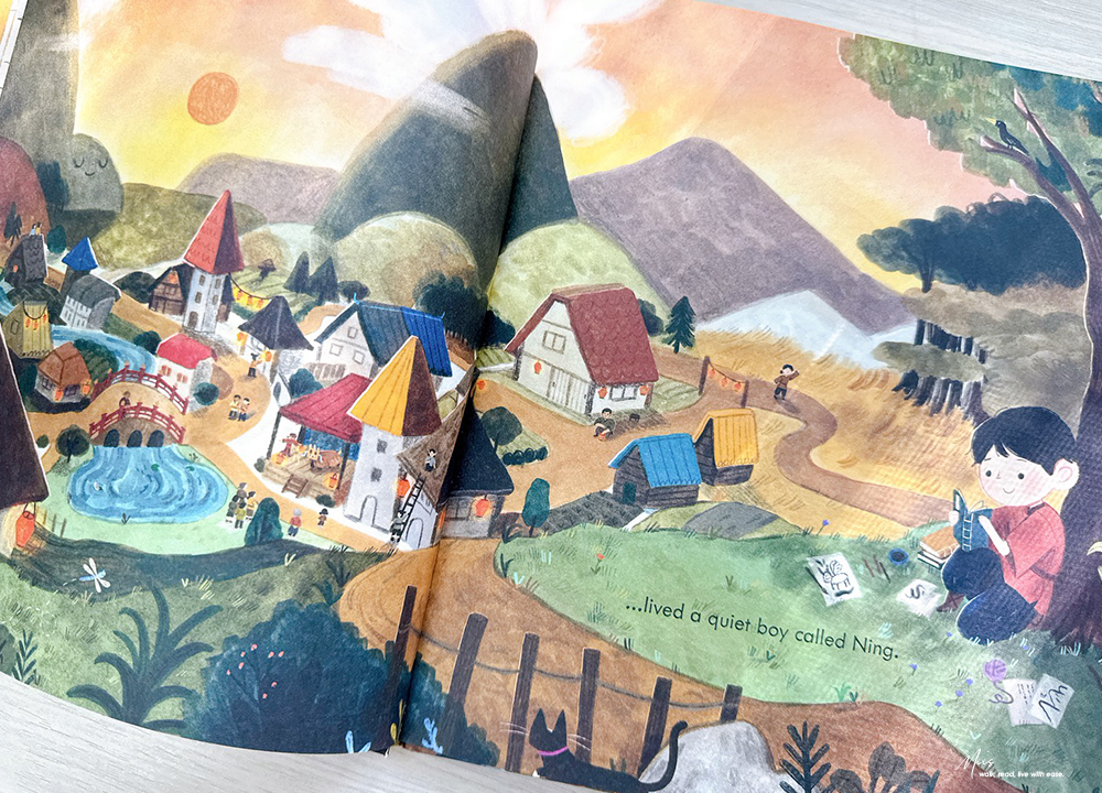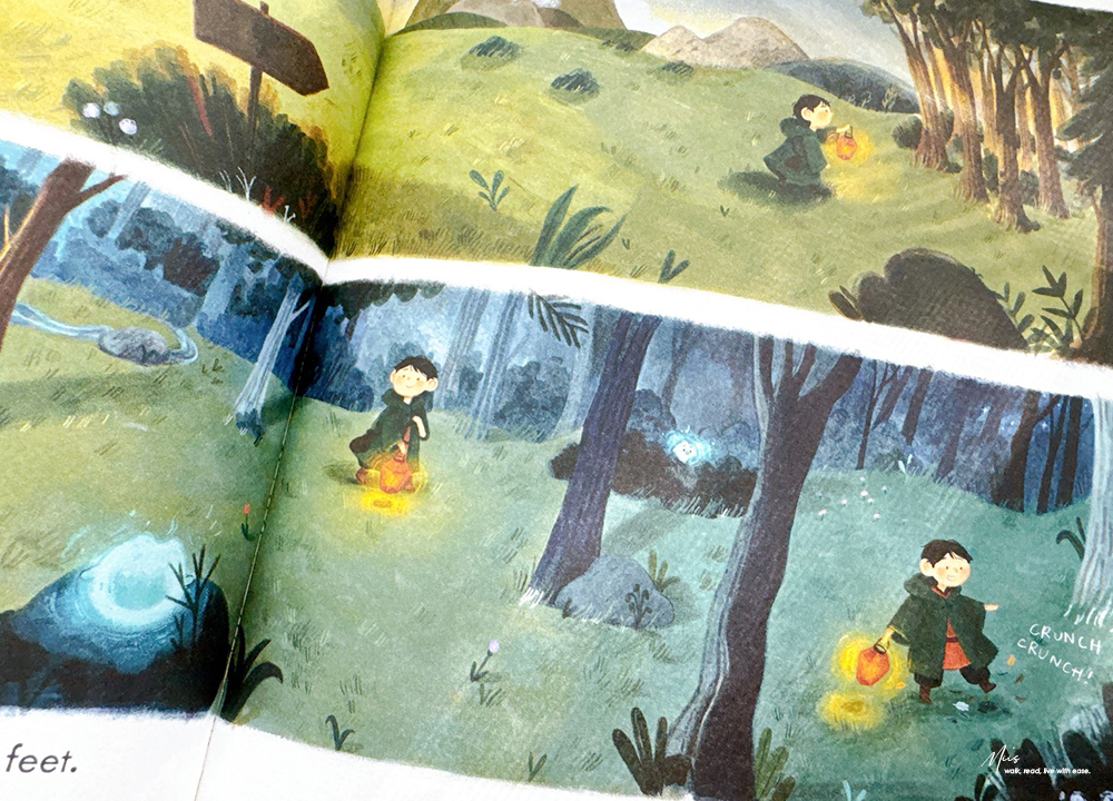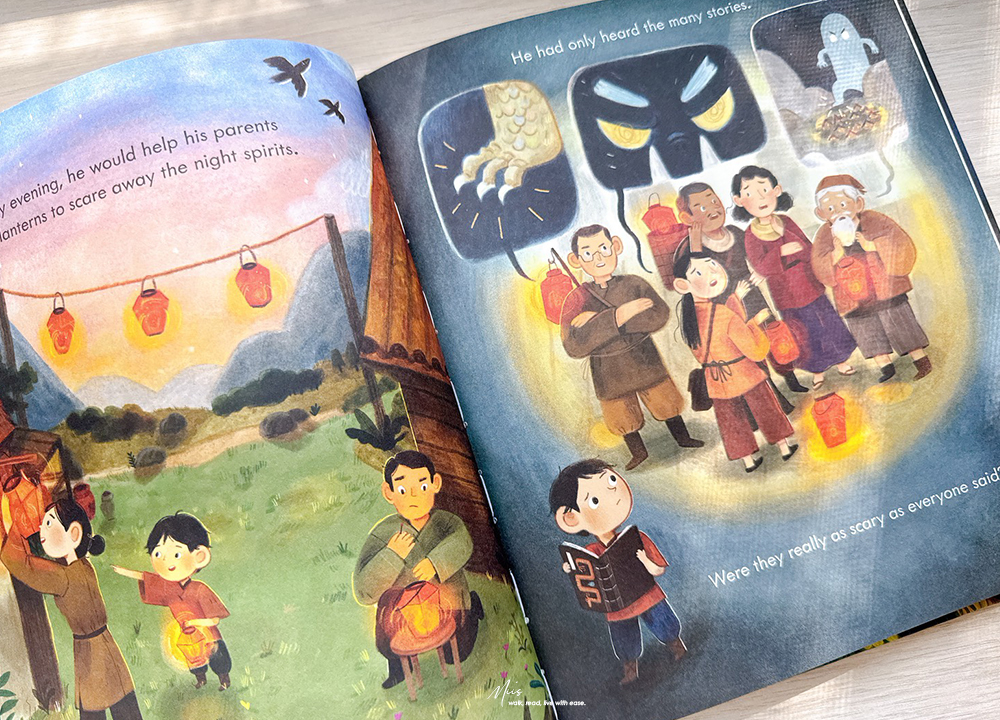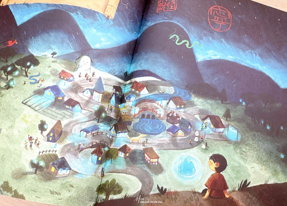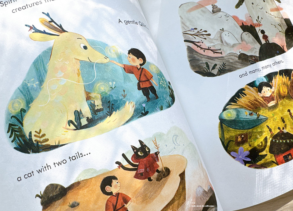 在滿是西方奇幻的英文繪本市場中,Ning and the Night Spirits就像從東方吹來的微風。作者 Adriena Fong 出生於新加坡,作品中帶著濃濃的亞洲氣息,細膩的筆觸、色調與柔和的光影。書中的場景、人物服飾、屋舍與山林的描繪,都充滿東方神秘的溫度,不只如此,專屬於東方的神獸也沒有少。