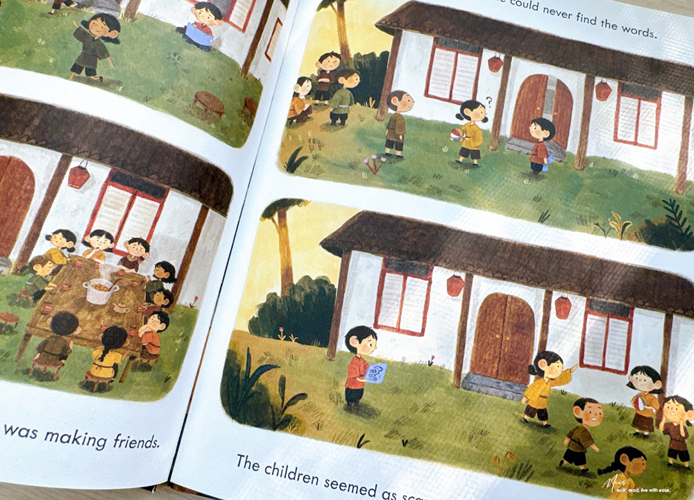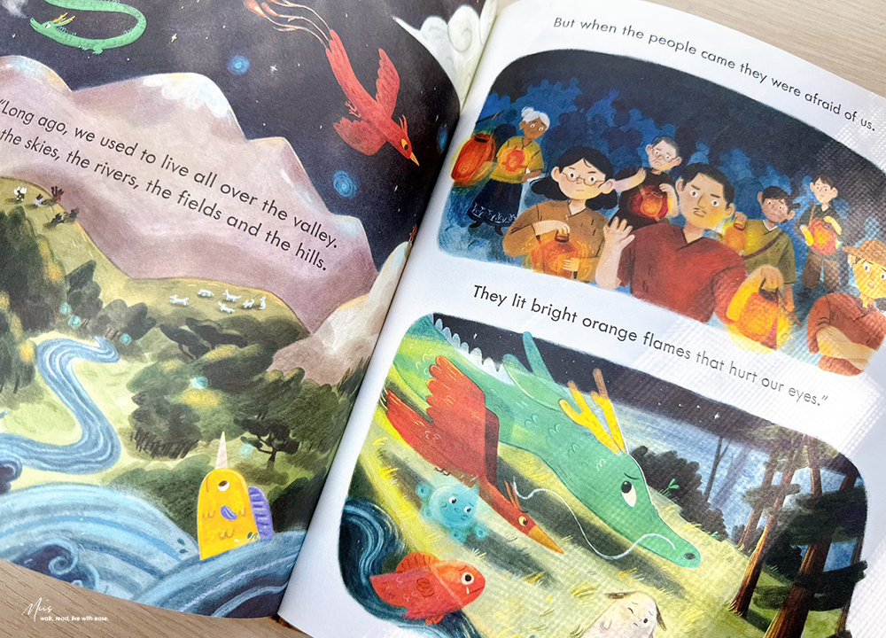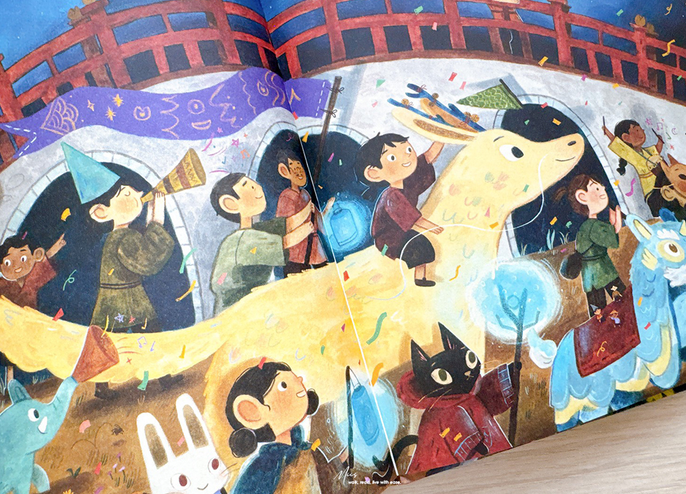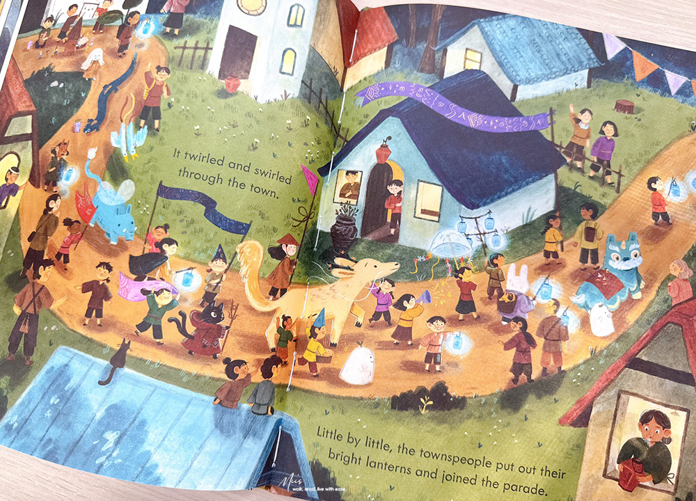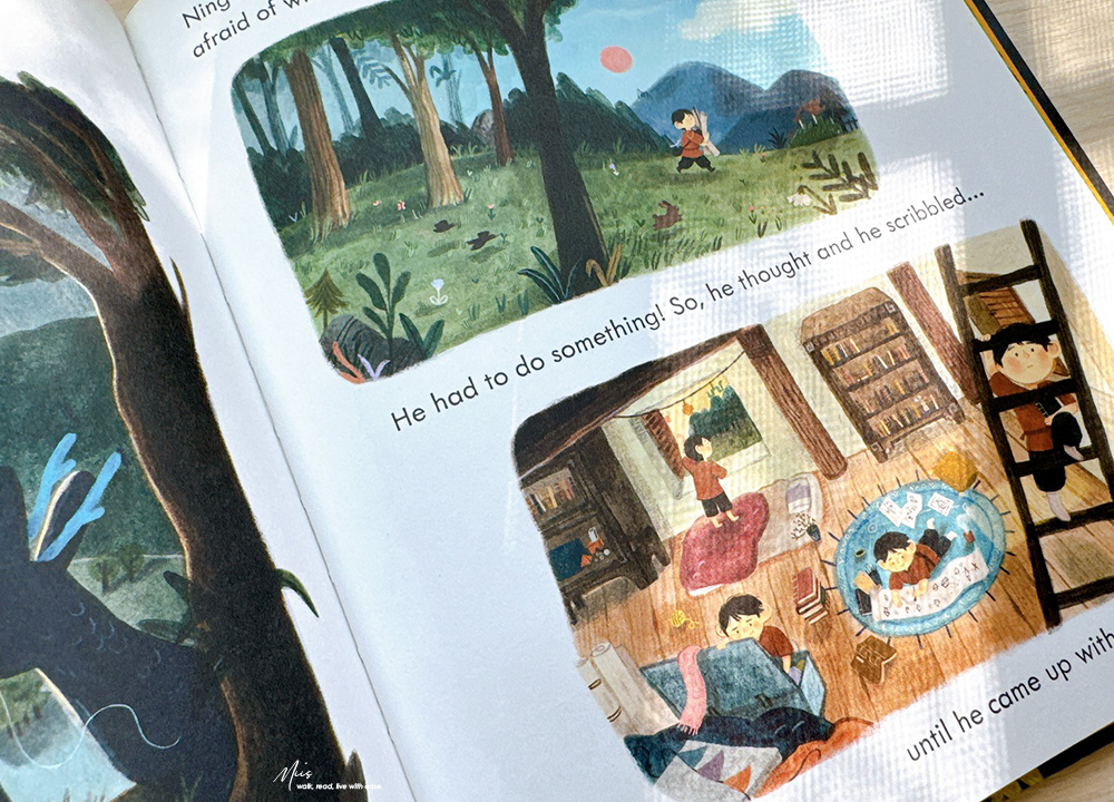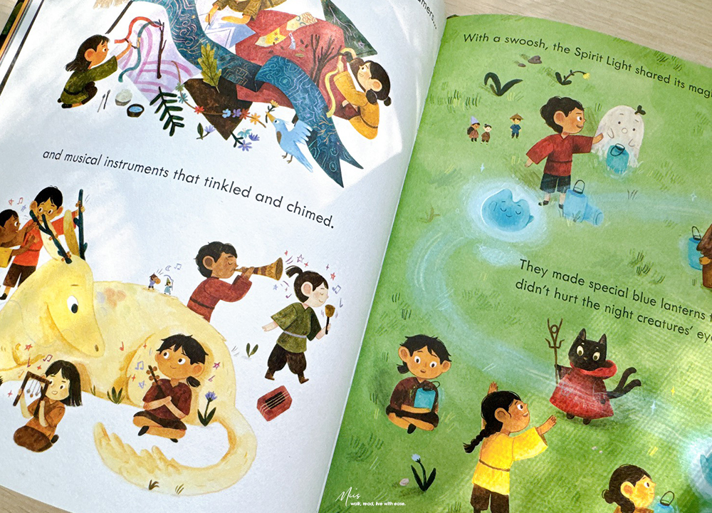 在滿是西方奇幻的英文繪本市場中,Ning and the Night Spirits就像從東方吹來的微風。作者 Adriena Fong 出生於新加坡,作品中帶著濃濃的亞洲氣息,細膩的筆觸、色調與柔和的光影。書中的場景、人物服飾、屋舍與山林的描繪,都充滿東方神秘的溫度,不只如此,專屬於東方的神獸也沒有少。