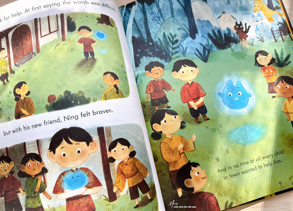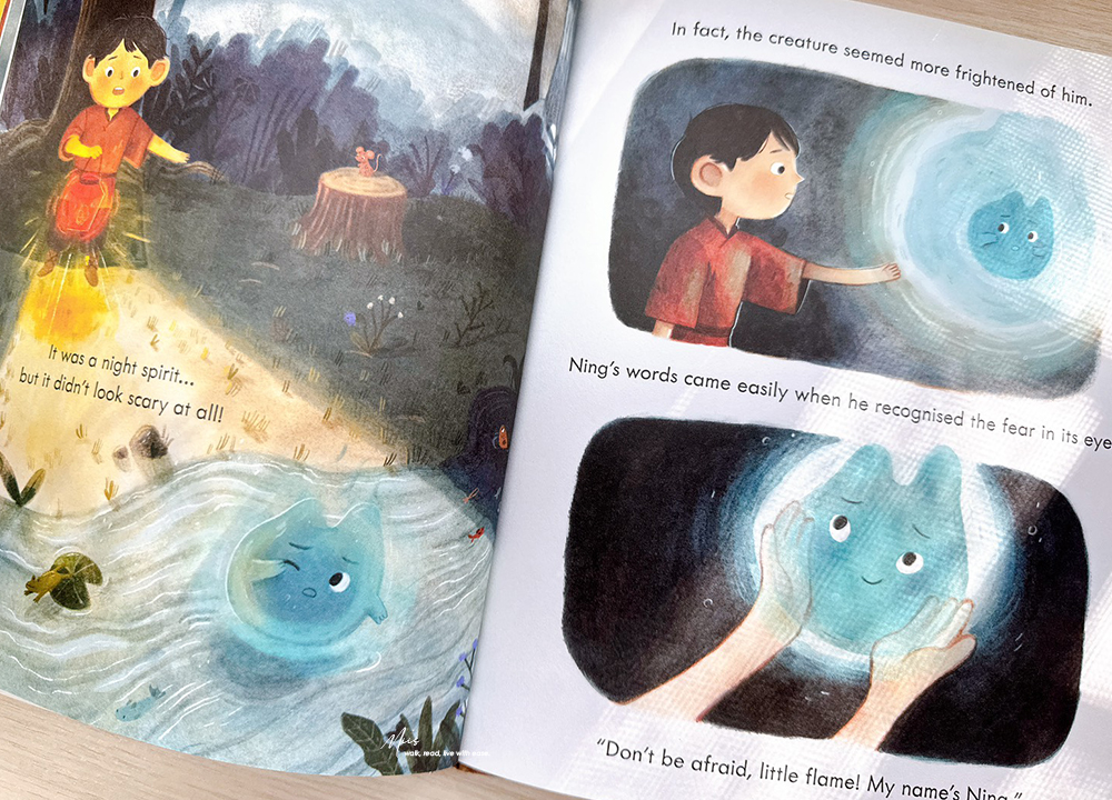 小男孩 Ning 住在一個小村莊裡。村民們說夜晚的森林裡藏著 Night Spirits(夜精靈),因此大家都很害怕,一到晚上村子裡的人都會點起燈籠來驅趕夜靈。但Ning 卻對此感到疑惑,但他也沒無法和其他人確認,因為交朋友對他來說也很可怕。某天,他獨自走進那個大家都懼怕的森林裡,他覺得放鬆且安心,甚至沒發現已經天黑了,睡著的Ning被一道閃光驚醒,是一隻夜靈,這隻像火焰的小夜靈看起來比 Ning 還要害怕。Ning溫柔地安撫他,很快他們便成為了朋友,Ning也發現交朋友並沒有那麼困難。他認識了許多溫柔又友善的夜靈,但現在有一個棘手的問題要解決,他要如何讓懼怕夜靈的村民們了解,夜靈一點都不可怕….以下分享部分書頁