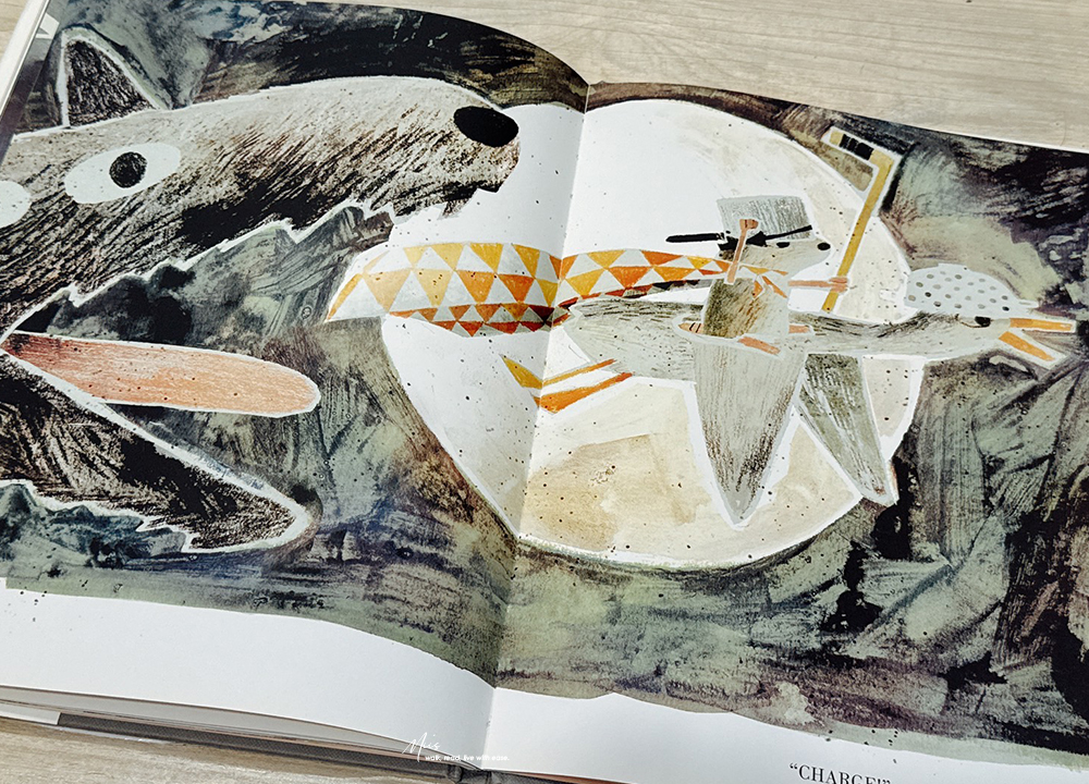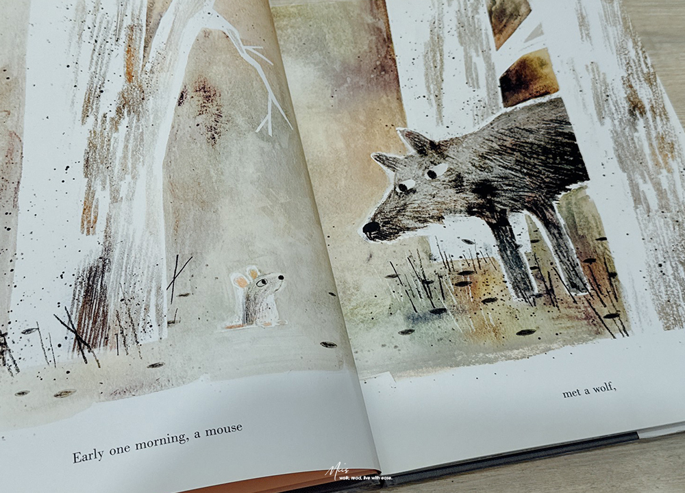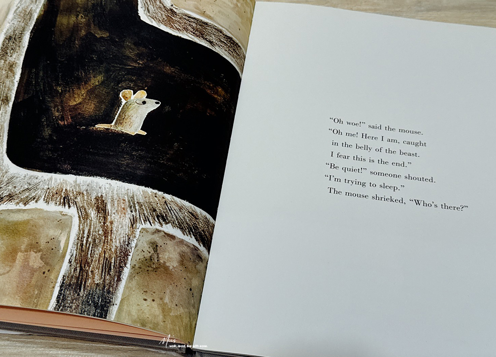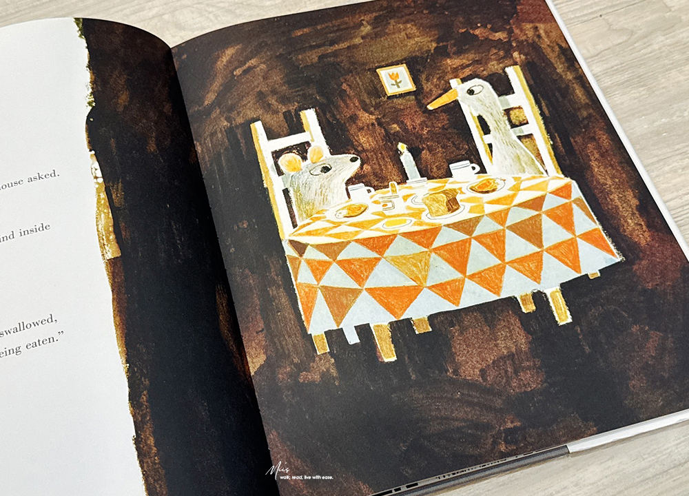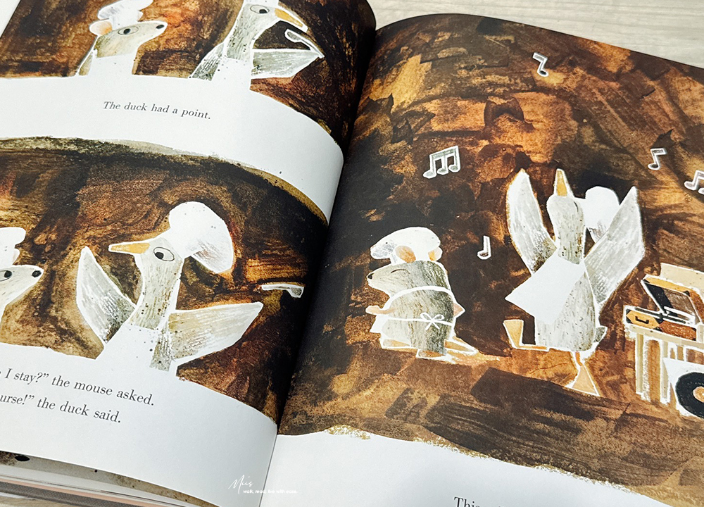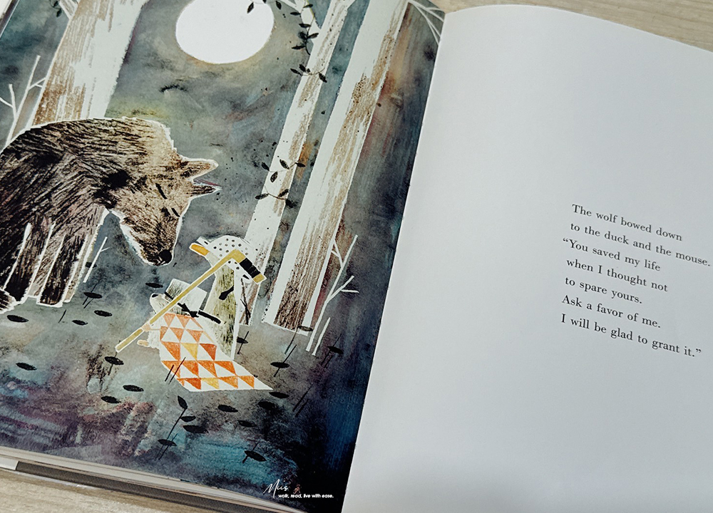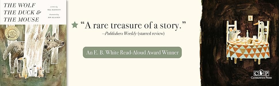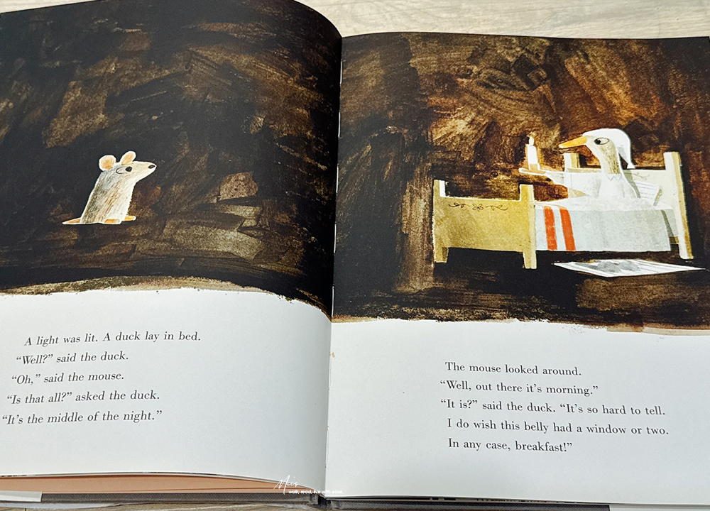由 Mac Barnett 與 Jon Klassen 聯手打造的 The Wolf, the Duck, and the Mouse,於 2017 年 10 月出版,後來也推出了硬頁本版本。這個故事的概念既荒謬又有趣,被大野狼吞下的小老鼠,在狼肚子裡遇見一隻鴨子,他們一起開派對、開香檳?一個顛覆常理的寓言故事。但也正因如此,才更能讓小讀者在會心一笑之餘,學會思考當生活處境改變時,還能做出哪些不同的選擇。